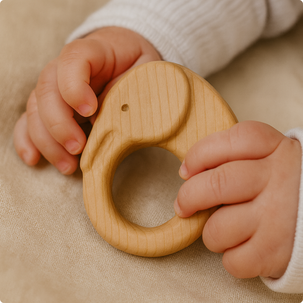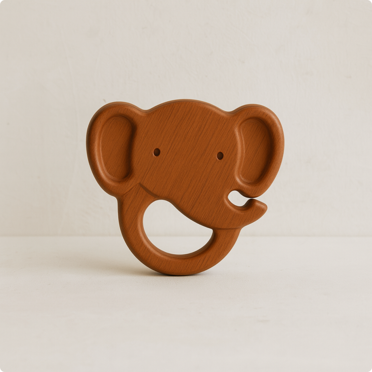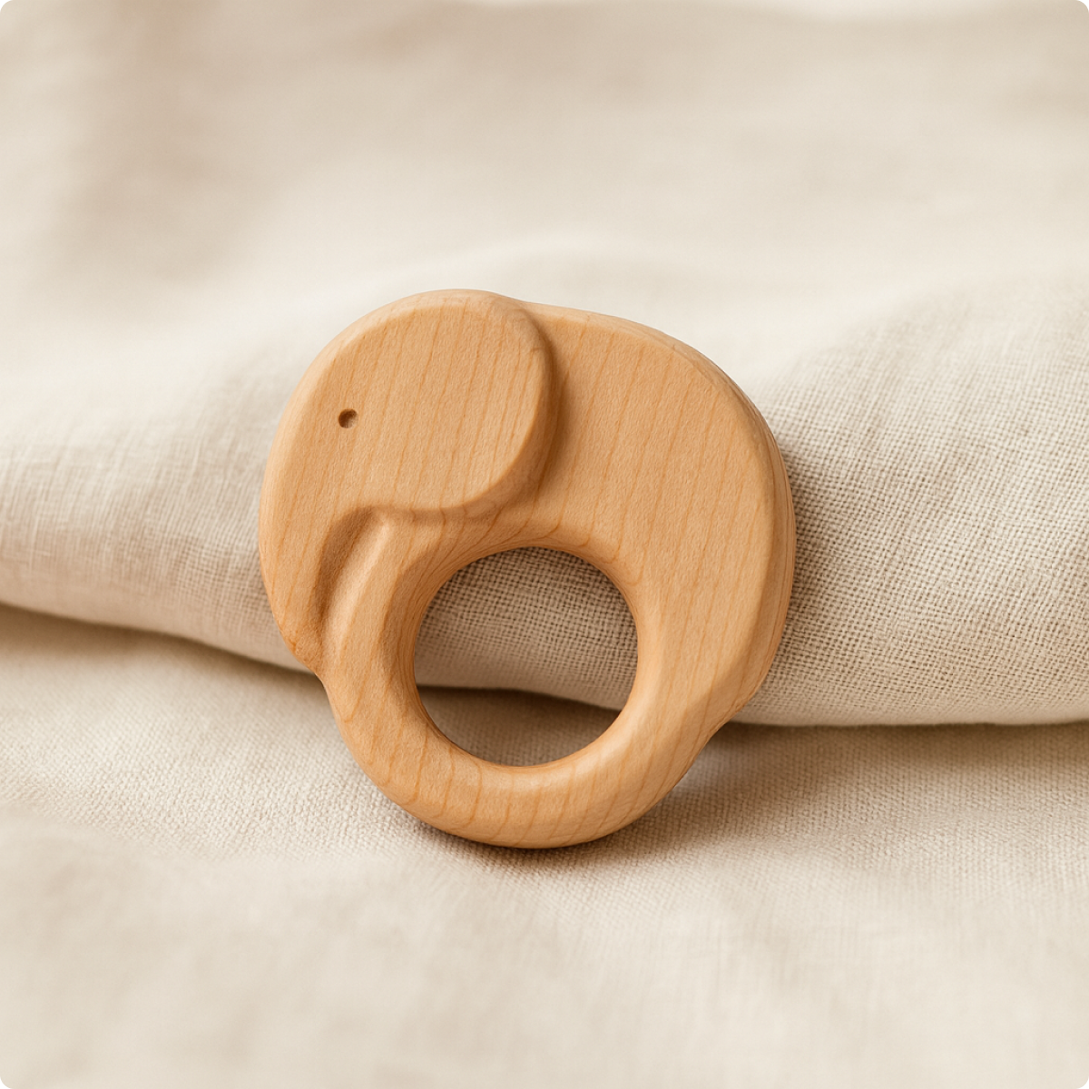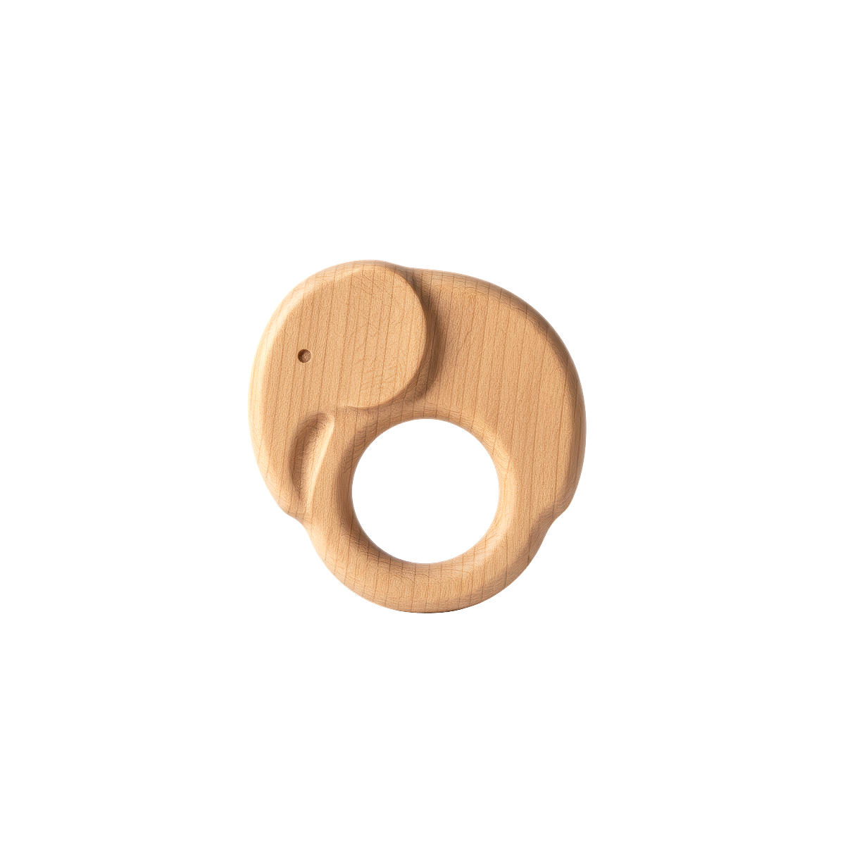 A charming, lightweight elephant teether made from smooth, natural light wood. Offers soothing relief for teething babies and is perfectly shaped for small hands.
