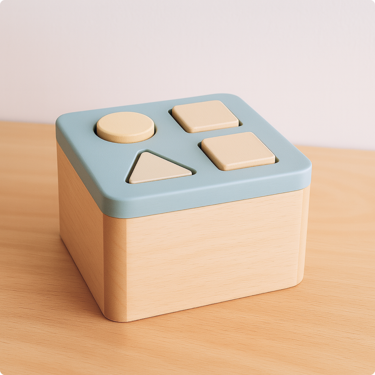 A wooden shape sorting toy featuring various geometric blocks (circles, squares, triangles) designed to fit into matching slots, highlighted by a vibrant turquoise base and details.