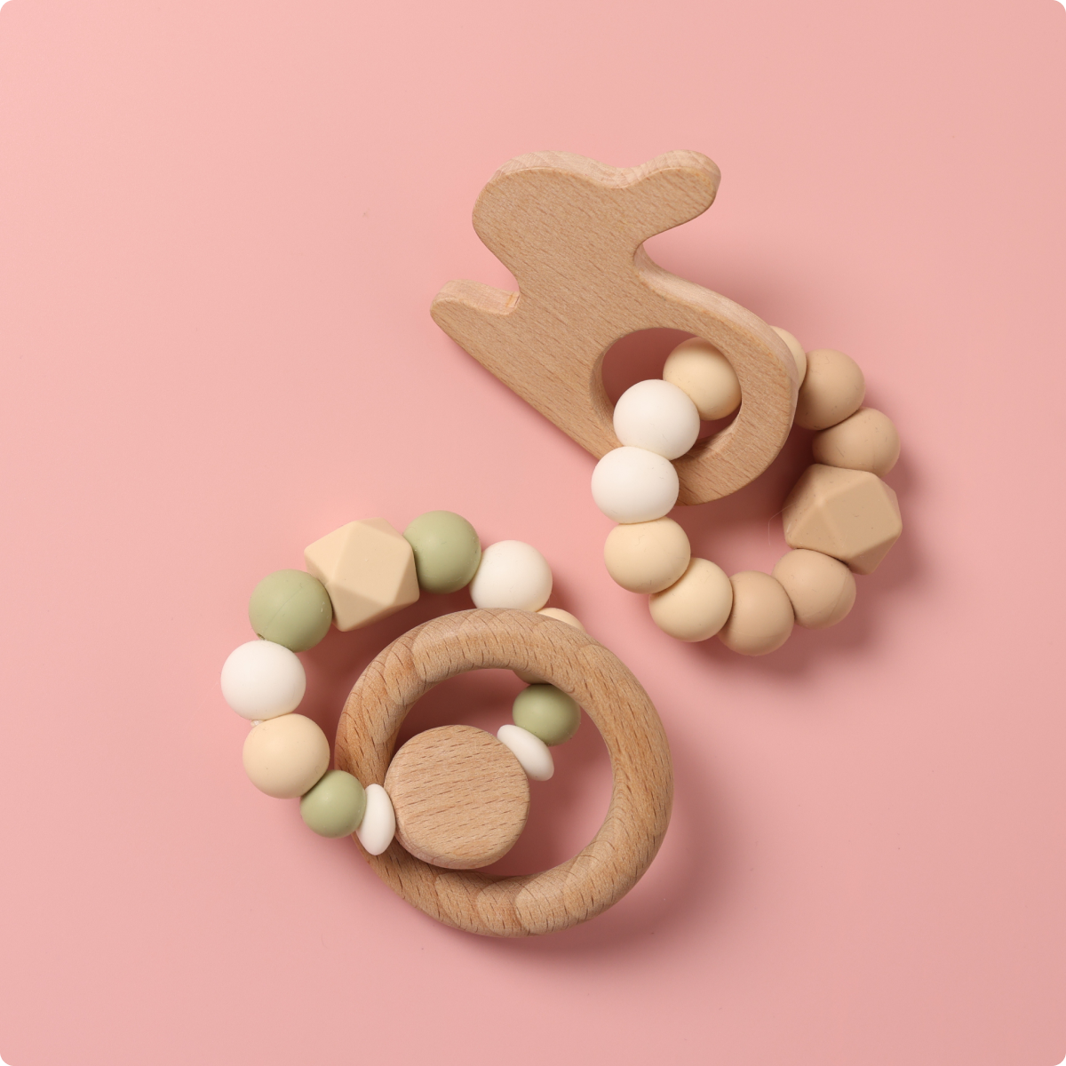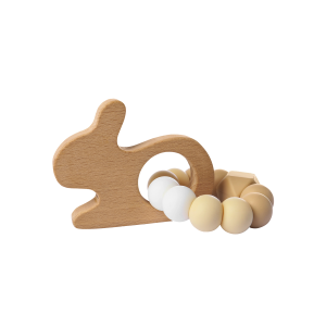 An adorable wooden rabbit rattle featuring smooth, easy-to-grip ears and a gentle sound, perfect for soothing and stimulating the youngest babies.
