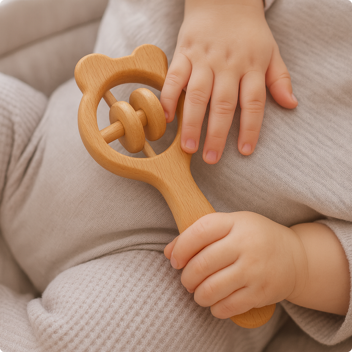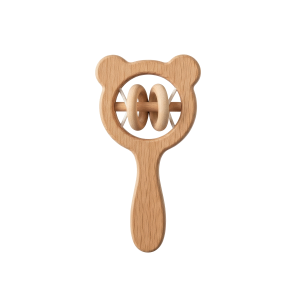 A sweet, wooden teddy bear rattle designed for tiny hands. Features a gentle sound and smooth, natural finish for safe, sensory development.