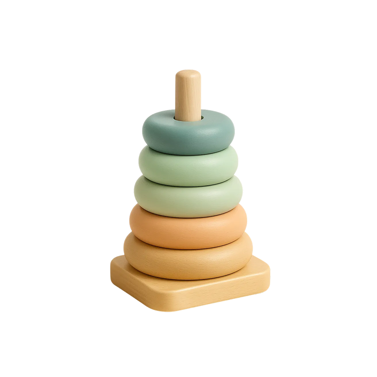 A beautiful wooden stacking pyramid featuring rings in soothing pastel colors. This classic toy promotes understanding of size order, fine motor development, and aesthetic appreciation.